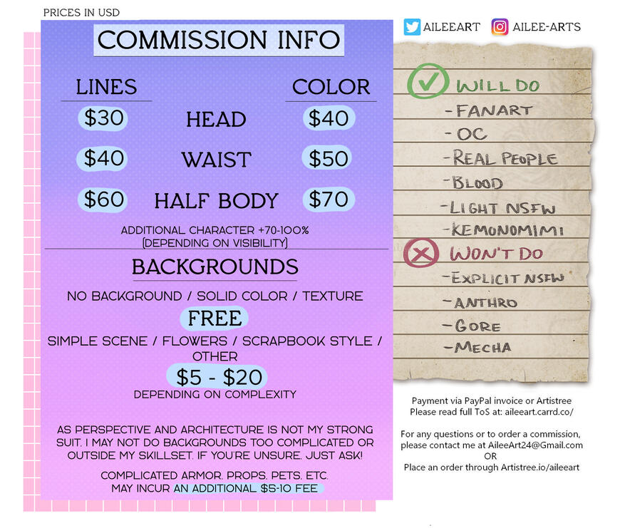Artistree does charge a platform fee of 6.5%, so it will cost a little more than the listed prices, but you'll get full buyers protection, with all communication happening on-platform, and a tree is planted for every order made. :)Otherwise you may simply email me at [email protected] or DM me on Discord @ aileeartInclude references and a description of what you want. i.e pose, angle, expression, clothing/accessories, color if applicable, etc. Other than that, I will default to the reference and my own choices, so if you want something specific, please be clear and provide image reference when possible!I will start after I receive the payment. I'll send a rough sketch and allow a couple rounds of revisions, after which only minor adjustments can be made.I may post the commissioned piece on any of my social platforms, use as a sample in a portfolio, or make prints of.If you have any questions, I'm happy to clarify anything, so please don't hesitate to contact me 😊